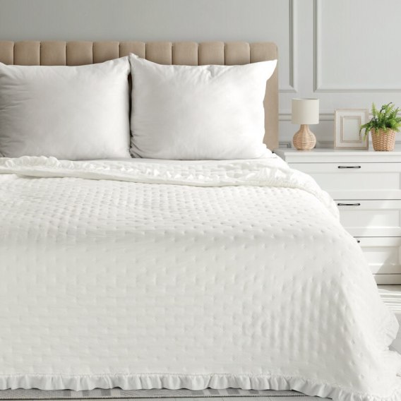Einfarbige Tagesdecke im Heißpressverfahren hergestellt, mit Rüschen besetzt, Breite: 220 cm, Länge: 240 cm, Farbe: creme, Gewicht: 80 g/m², Zusammensetzung: 100 % Polyester