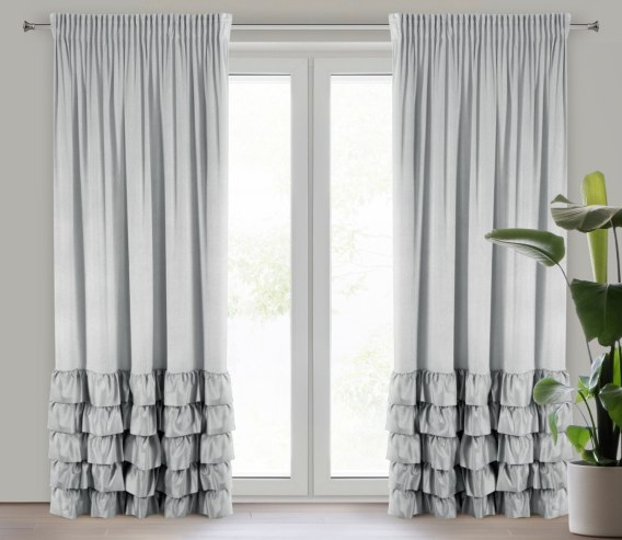 Samtvorhang mit Rüschen im unteren Teil verziert Breite: 140 cm. Länge: 250 cm. Farbe: silber. Gewicht: 200 GSM. Material: 100% Polyester
