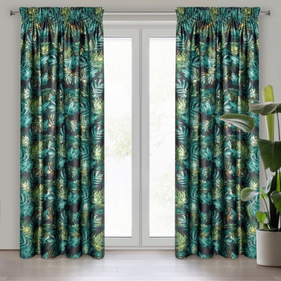 • Vorhang DAVOS schwarz grün 140x270 Botanisches Muster Kräuselband Tunnelzug