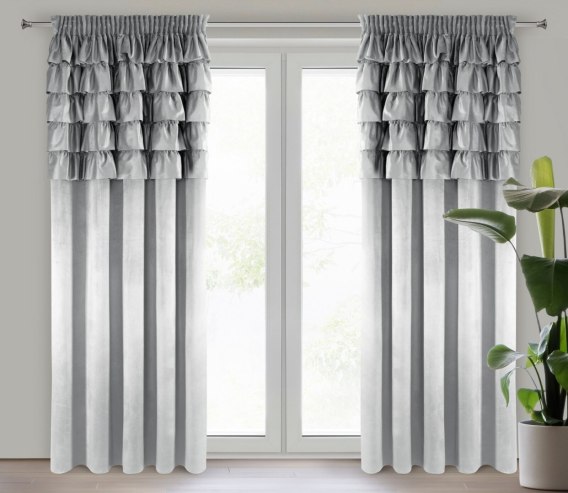 Samtvorhang mit Rüschen im oberen Teil verziert Breite: 140 cm. Länge: 270 cm. Farbe: silber. Gewicht: 200 GSM. Material: 100% Polyester